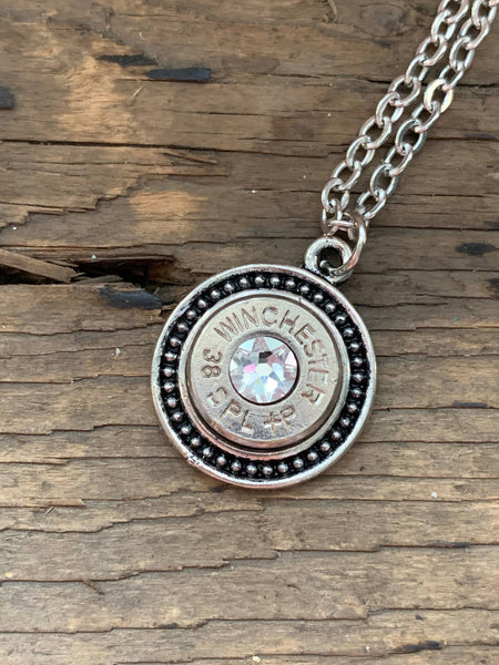 This is a silver plated bullet necklace with a 38 special bullet and a Swarovski crystal in the center Necklace is 16" with a 2" extension